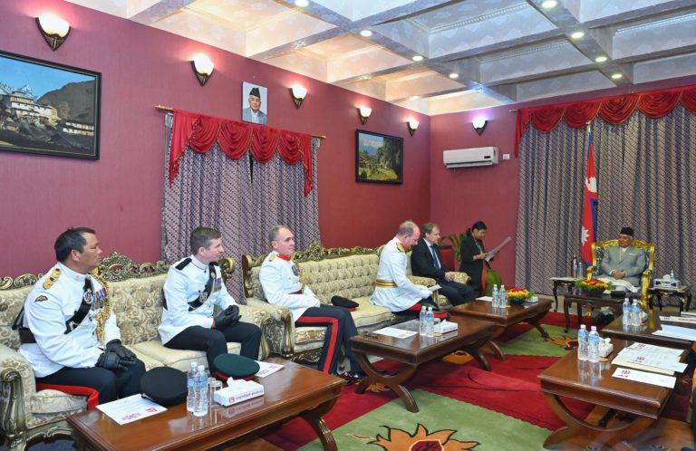 काठमाडौं – राष्ट्रपति रामचन्द्र पौडेलसमक्ष संयुक्त अधिराज्य बेलायती सेनाका रथी तथा गोर्खा बिग्रेडका कर्णेल कमान्डेन्ट रिचार्ड वार्डलो ओबीईसहितको टोलीले शिष्टाचार भेट गरेको छ ।