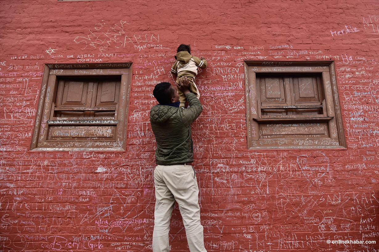 आज काठमाडौंको स्वयम्भूनाथमा अभिभावकले बालबालिकालाई अक्षर लेख्न सिकाएका छन् ।