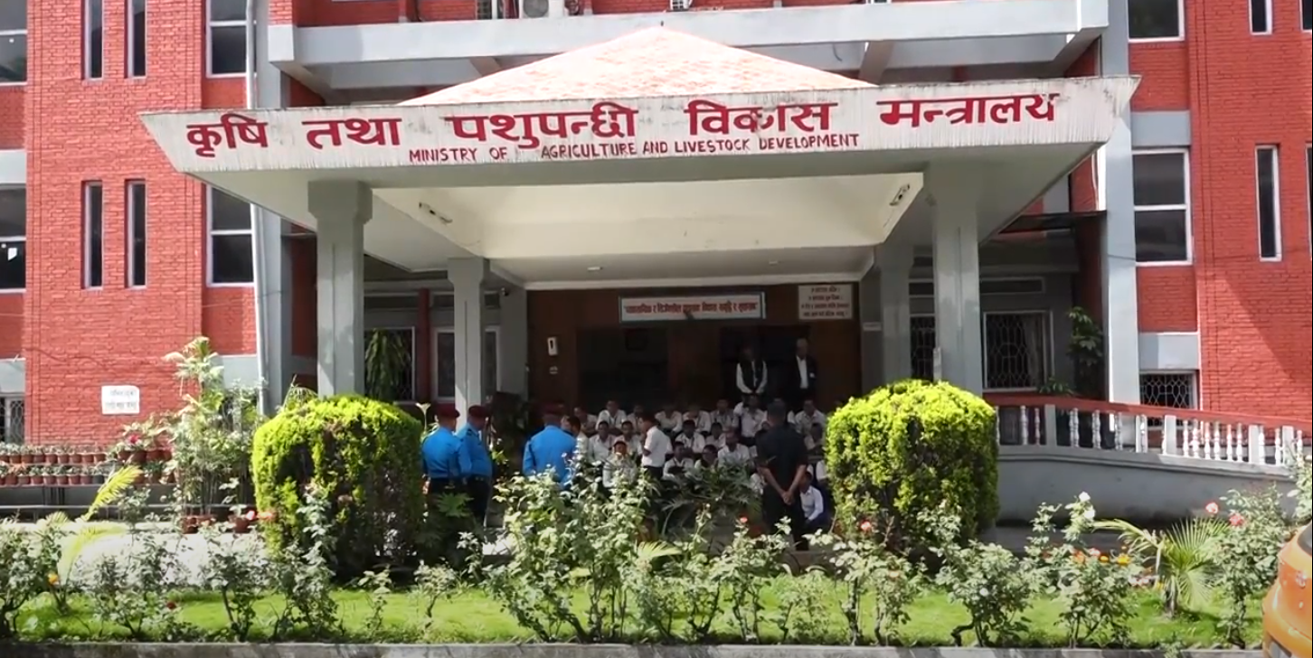अन्य मन्त्रालयमा मन्त्रीको स्वागतका लागि कर्मचारी पुष्पगुच्छासहित लाइन लागेर बसिरहेका बेला कृषि तथा पशुपन्छी विकास मन्त्रालयका कर्मचारी मन्त्रीको ध्यानाकर्षण गराउन मूलगेटमै धर्नामा बसिरहेका हुन् ।
