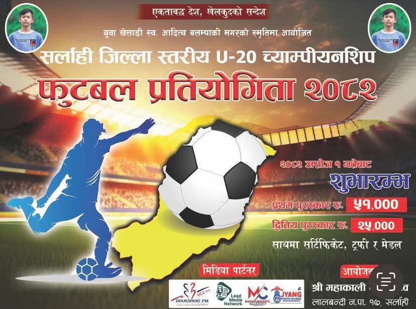 लालबन्दी । एक वर्षअघि मकवानपुरमा पहिरोमा परेर ज्यान गुमाएका युवा फुटबल खेलाडी आदित्य बलम्पाकी मगरको स्मृतिमा सर्लाहीको लालबन्दी नगरपालिका–१७ रानीगन्जमा जिल्लास्तरीय २० वर्षमुनिको फुटबल प्रतियोगिता आयोजना हुने भएको छ ।