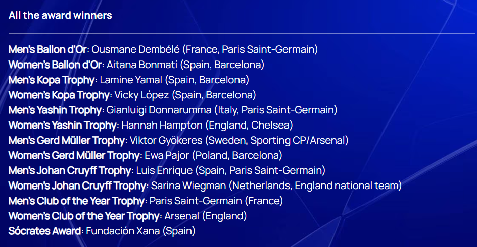 पहिलोपटक बालोन डि’ओर जितेका डेम्बेलेले पीएसजीबाट सन् २०२४-२५ को च्याम्पियन्स लिग जित्नुका साथै लिगमा पनि ३७ गोल र १५ असिस्ट गर्दै उत्कृष्ट प्रदर्शन गरेका थिए ।