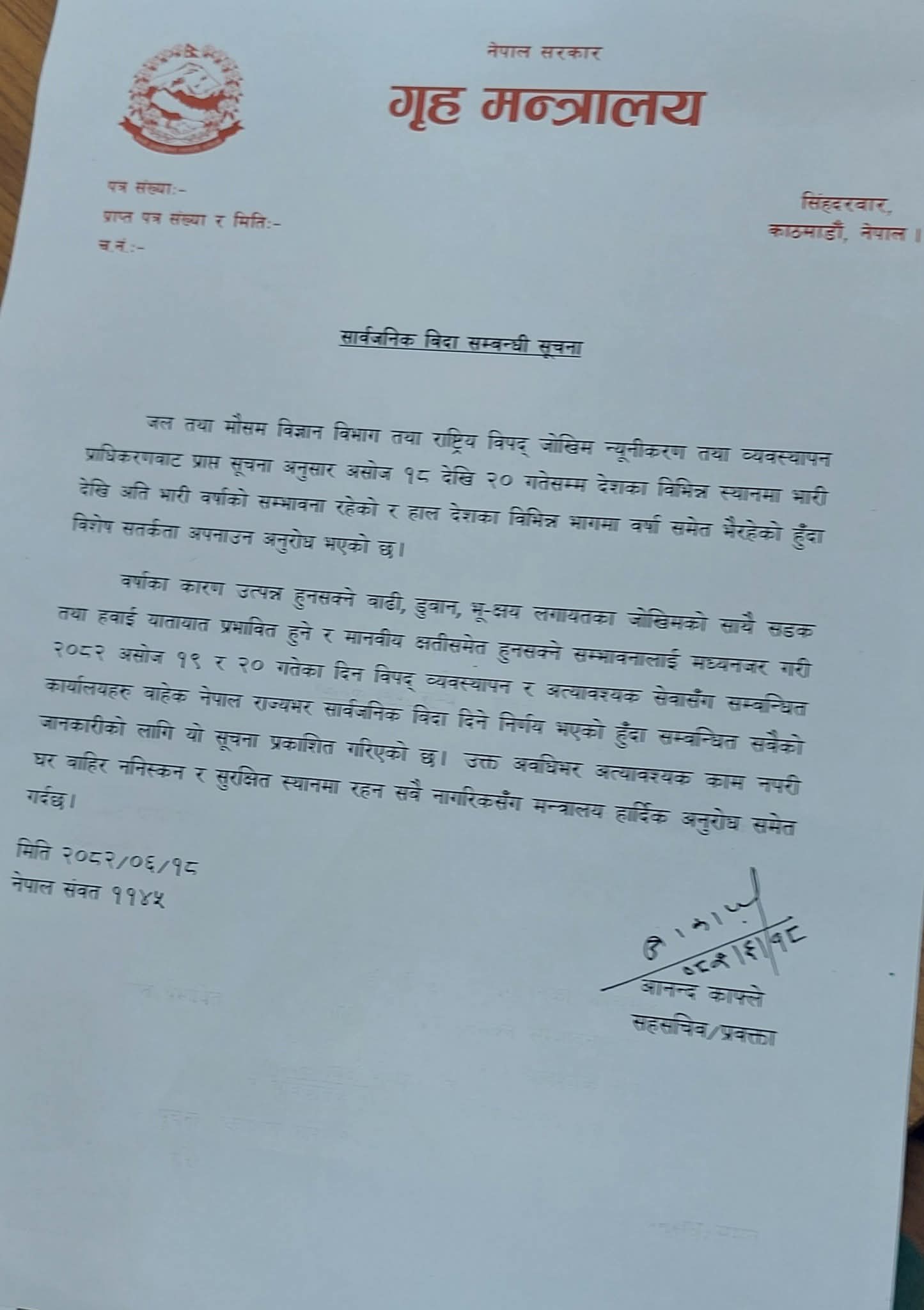 अविरल वर्षासँगैको प्रतिकुल परिस्थितिलाई मध्यनजर गर्दै सरकारले थप दुई दिन बिदा दिएको हो ।