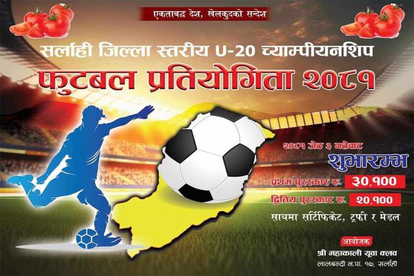 सर्लाहीको लालबन्दीमा २० वर्षमुनिका खेलाडीहरू सम्मिलित जिल्लास्तरीय फुटबल प्रतियोगित आयोजित हुदै